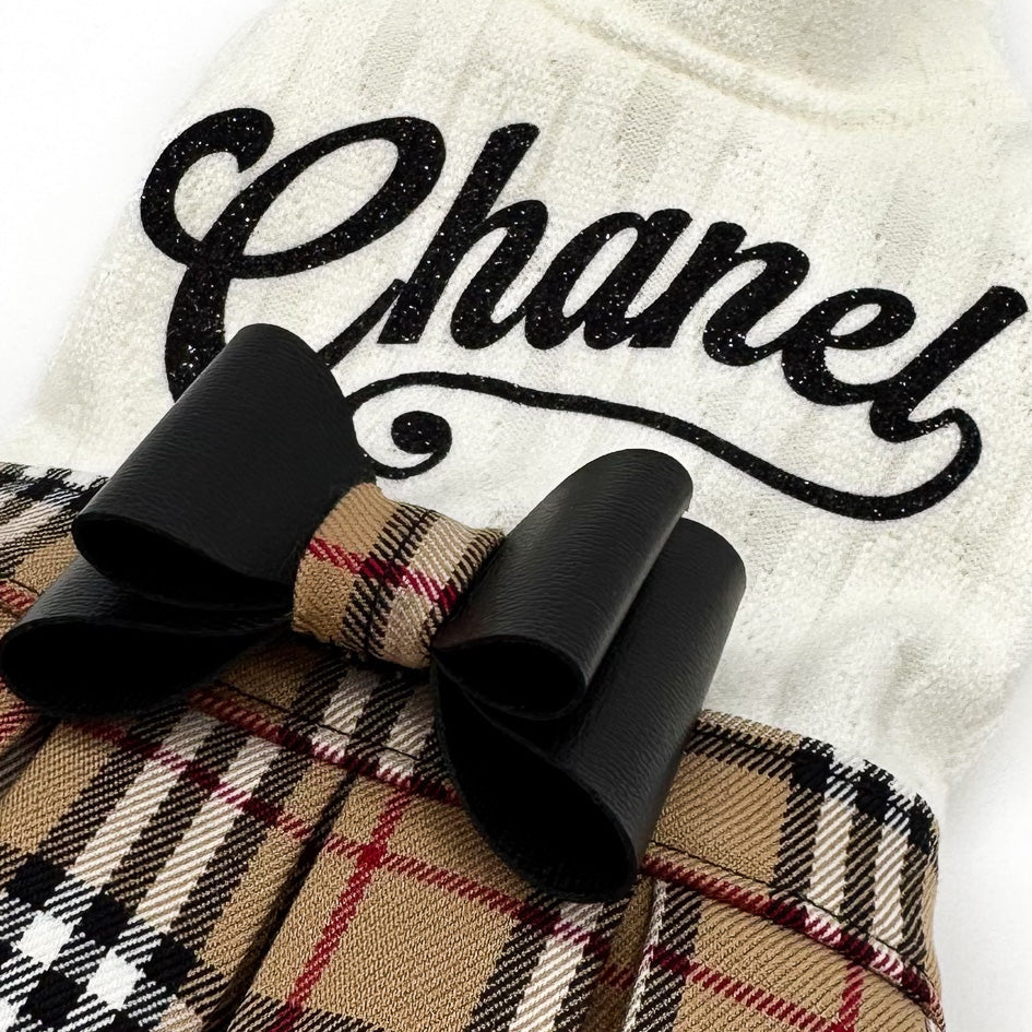 L'abito Brit è il perfetto connubio tra stile classico e modernità. Realizzato con una parte superiore in maglia e una gonna doppia a pieghe in tessuto scozzese, questo capo è pensato per le cagnoline che amano distinguersi con eleganza in ogni occasione.