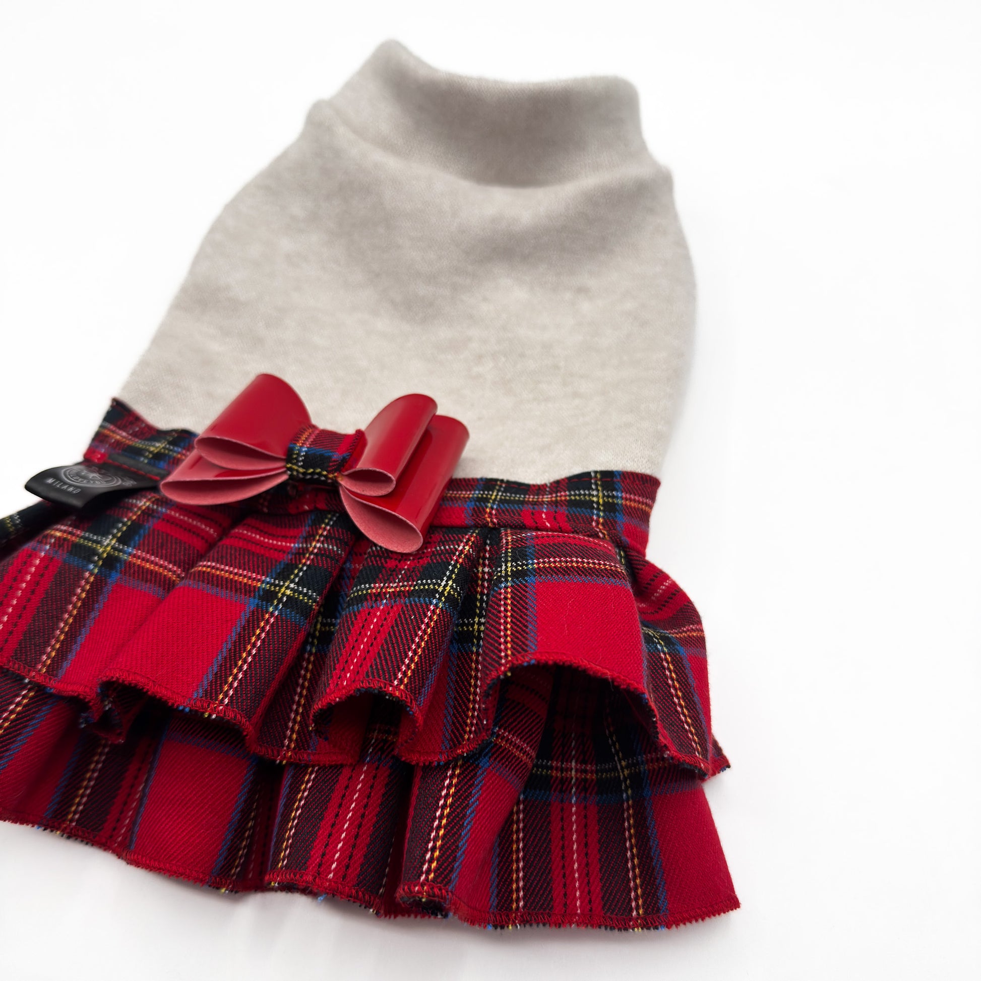 L'abito Chris è un capo dal design raffinato che unisce comfort e stile festivo. Con il corpo in maglia beige melange e una gonna scozzese rossa a pieghe, è perfetto per aggiungere un tocco di classe e calore al guardaroba della tua cagnolina.