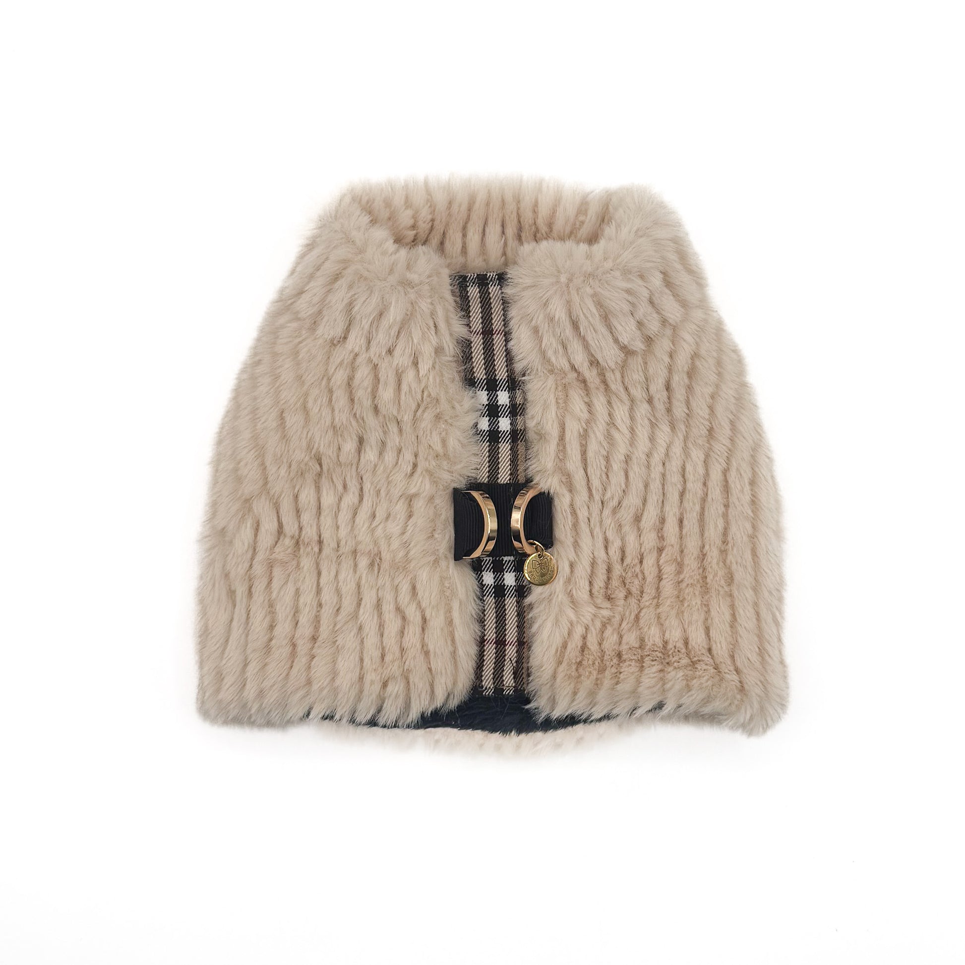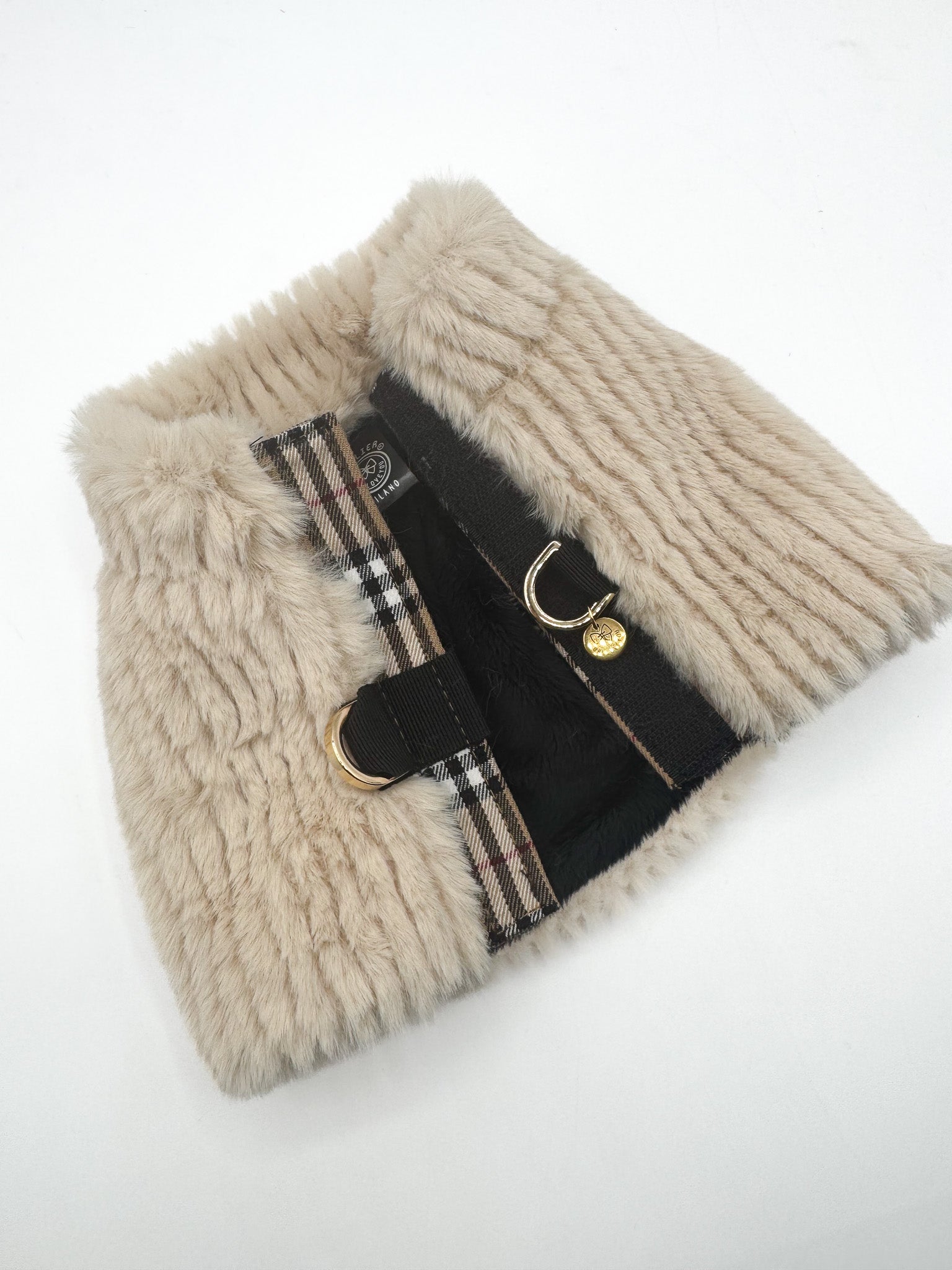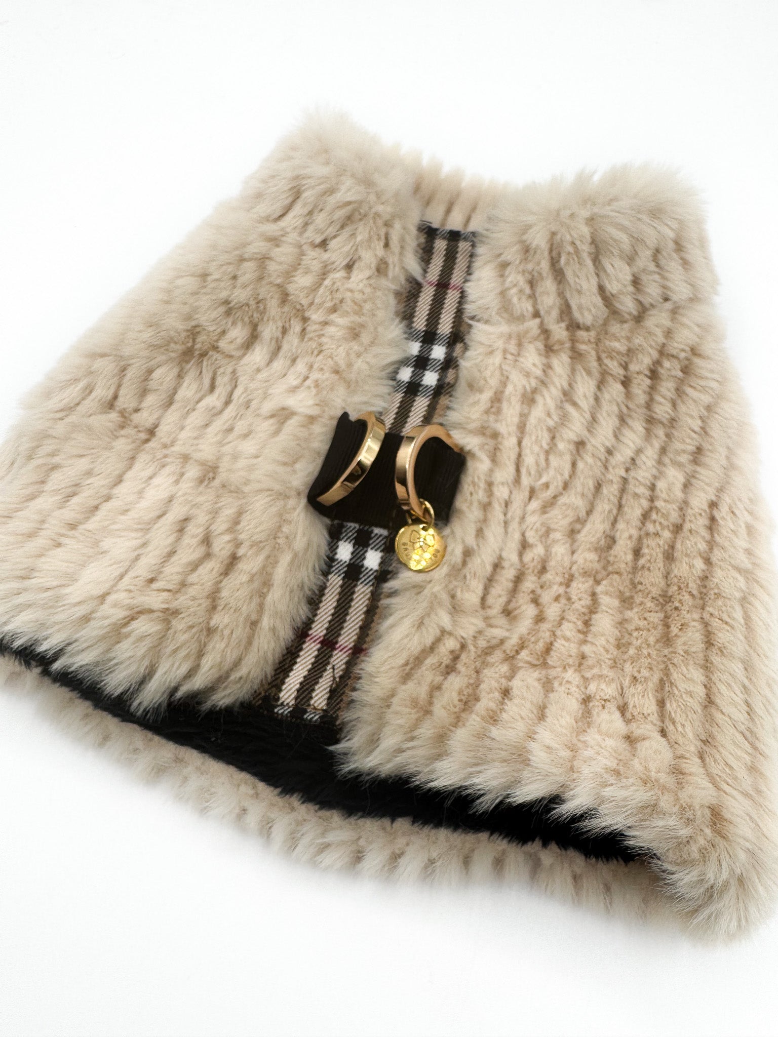 Il corpetto Alina è l'accessorio perfetto per completare con eleganza gli abiti con la gonna, aggiungendo un tocco caldo e raffinato. Realizzato in pelliccetta morbidissima con fodera interna in tessuto, è curato in ogni dettaglio per garantire comfort e vestibilità impeccabile ai cani di piccola taglia. Dotato di pratici ganci per il guinzaglio sulla schiena, unisce estetica e funzionalità in un capo che si distingue per lo stile sofisticato e la finitura artigianale. Disponibile in due varianti: la versione sabbia, perfetta abbinata all’abito Britt, e la versione rosa, delicata e femminile.