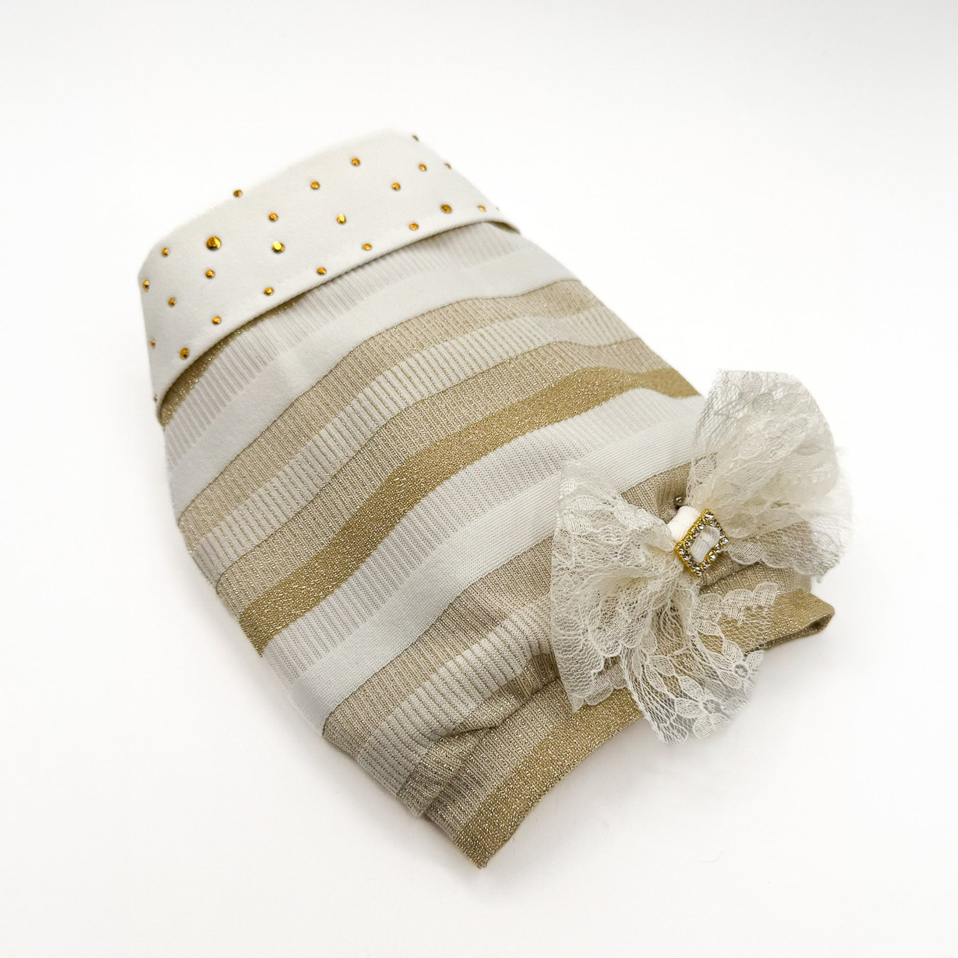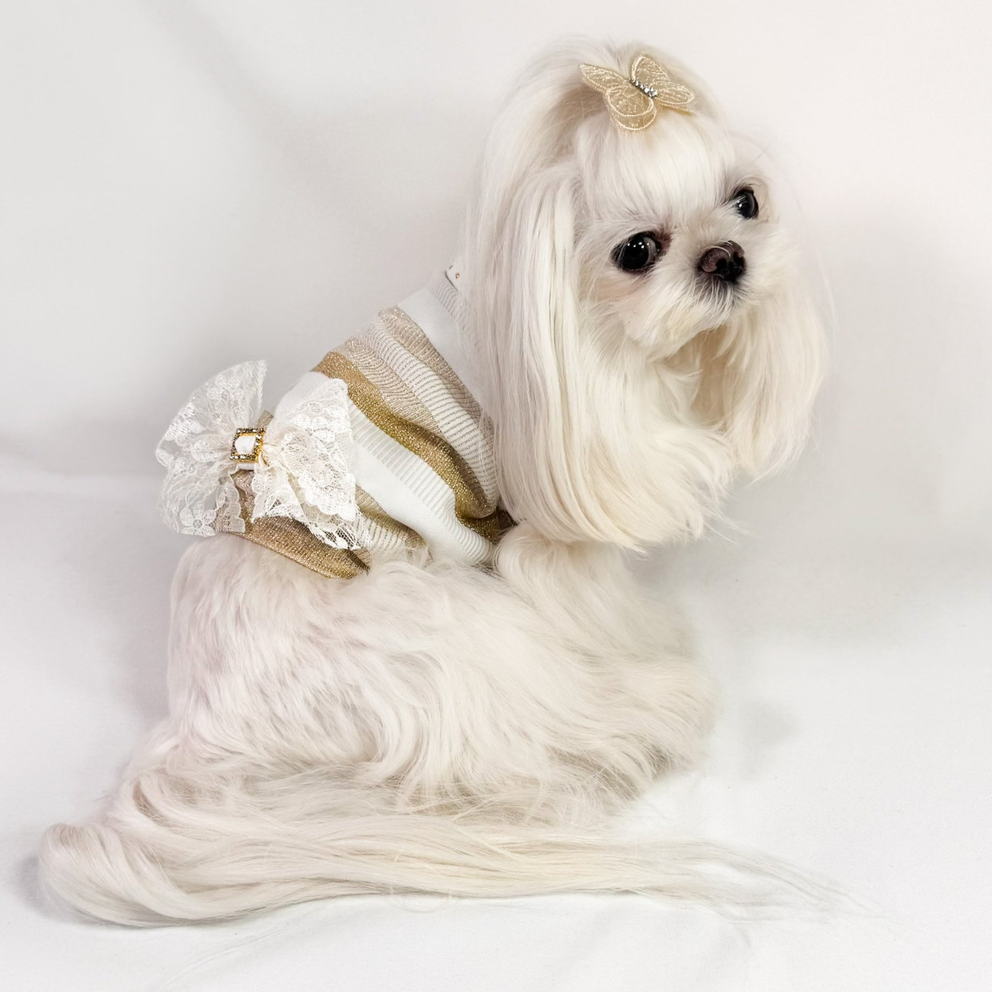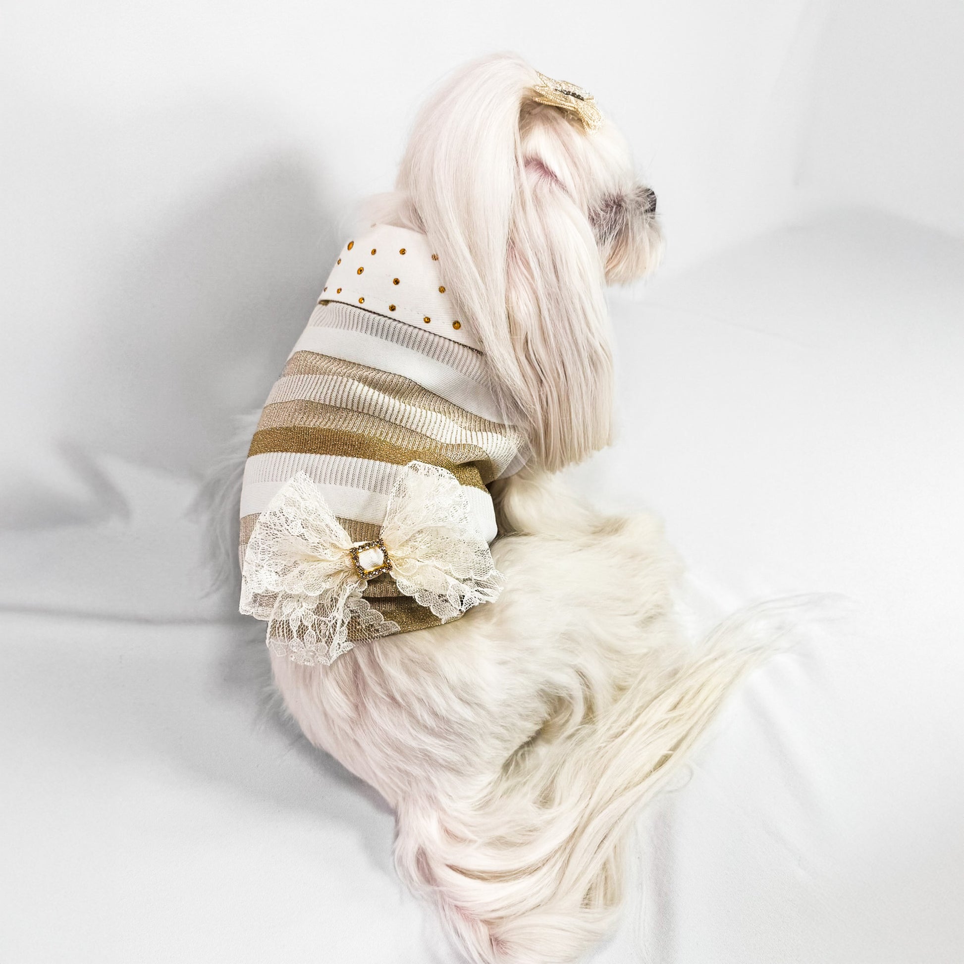 La felpina Nina è un capo prezioso e raffinato, pensato per i cani di piccola taglia che amano distinguersi. Realizzata in cotone rigato arricchito da un delicato filo di lurex, combina comfort e brillantezza in un equilibrio perfetto. Il collo in tessuto con microborchie dorate aggiunge un dettaglio sofisticato, mentre il fiocco in pizzo con spilla e centrale in strass dona un tocco couture che rende Nina ideale per le occasioni speciali come per i momenti quotidiani più chic.