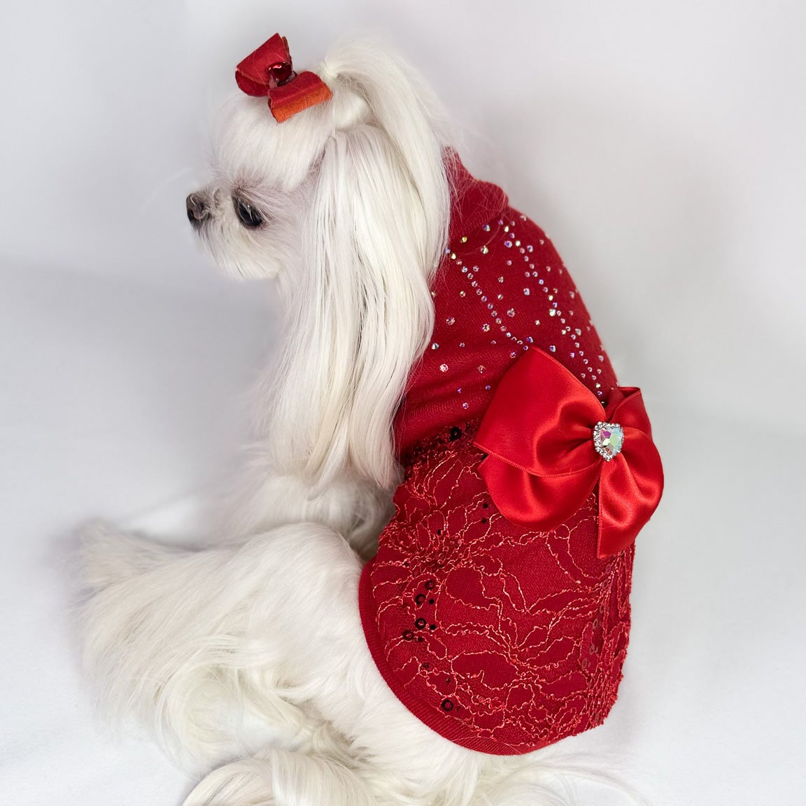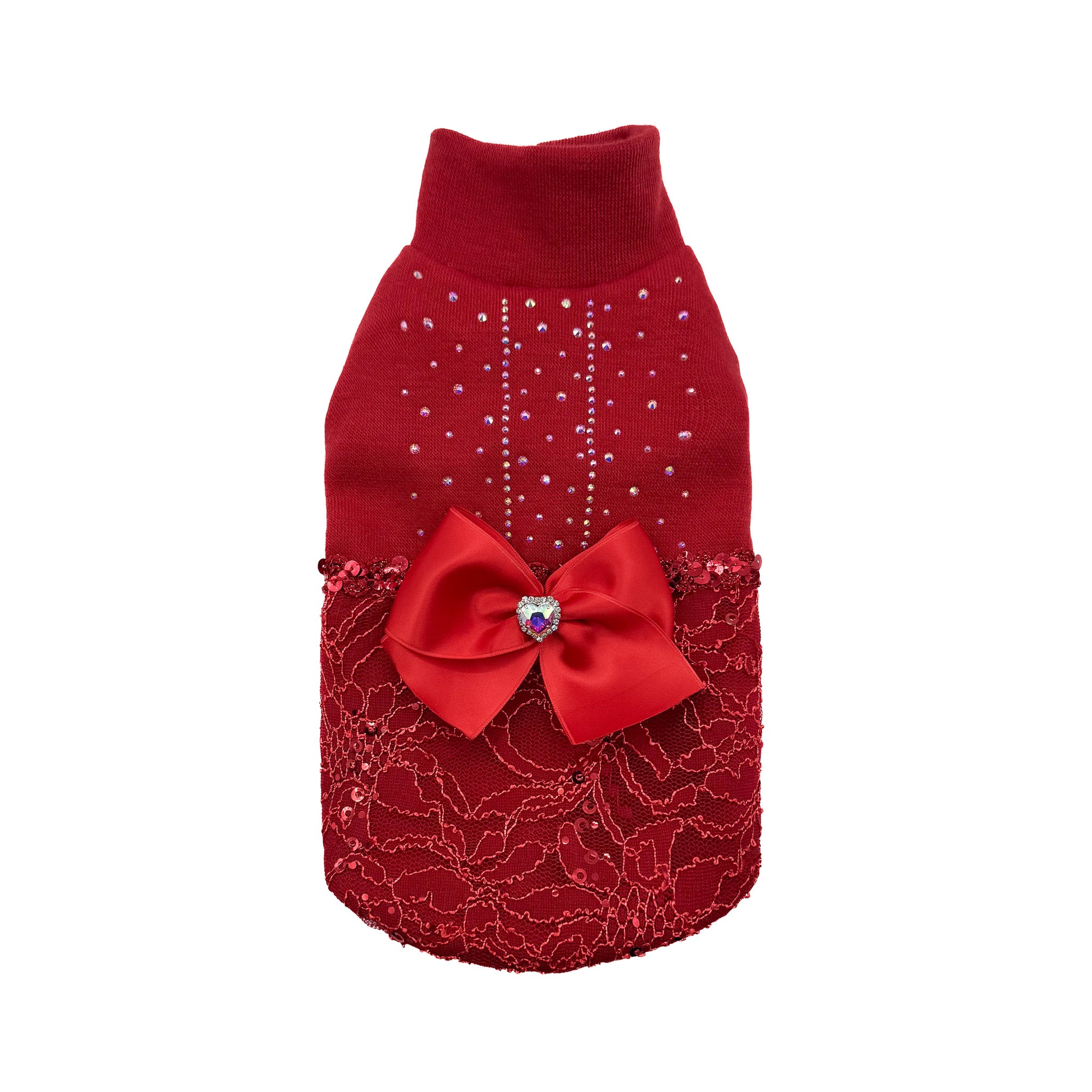 La parte superiore è illuminata da cristalli applicati a mano, che creano un effetto luminoso e armonioso. La parte inferiore è impreziosita da un pizzo ricamato applicato sul maglioncino, ricco di dettagli e brillante. A completare il capo, un fiocco in raso con spilla gioiello, removibile, che trasforma Mirabelle in un mini-abito perfetto per cerimonie, festività, shooting e momenti davvero speciali.