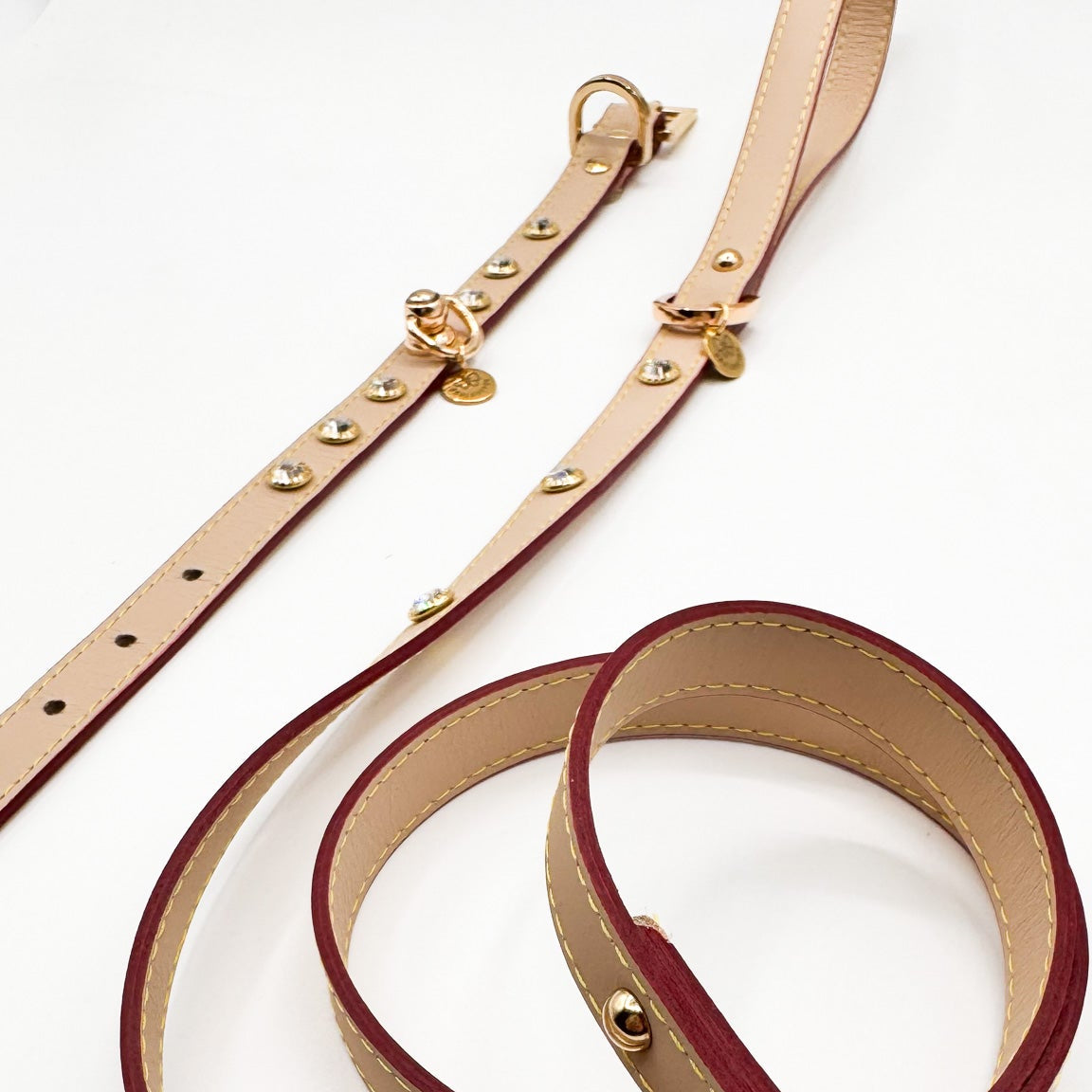 Un set esclusivo per cani di piccola taglia, composto da collare e guinzaglio artigianali, realizzati in pelle taglio vivo con lati bordeaux e impunturata giallo fluo e pelle color naturale a contrasto. I cristalli di altissima qualità applicati a mano donano un tocco di luce sofisticato, mentre le finiture curate nei dettagli assicurano stile e resistenza. Il guinzaglio misura circa 90 cm ed è dotato di moschettone robusto e anello per un aggancio pratico e sicuro. Un accessorio di lusso che unisce design, artigianalità e funzionalità per passeggiare con il massimo dello stile.